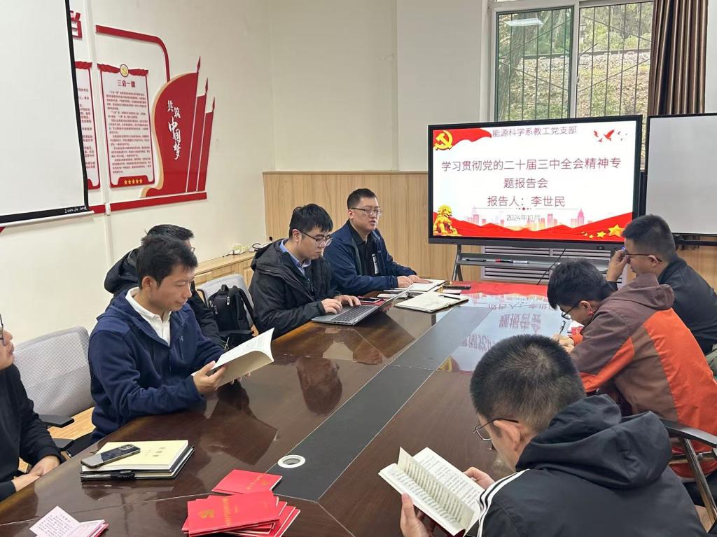 2024年10月30日,能源科学系教工党支部召开“学习贯彻党的二十届三中全会精神”专题宣讲会,党支部书记李世民做专题报告。