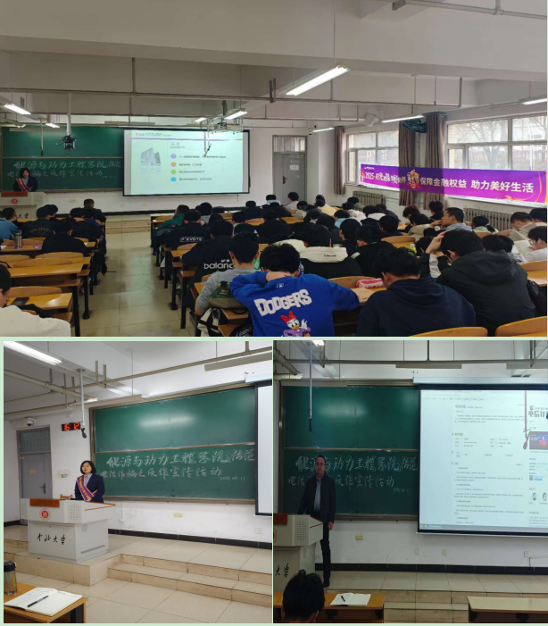 为切实增强大学生的安全防范意识,2025年3月11日下午,能源与动力工程学院在15202H教室举办了“防范电信诈骗,筑牢安全基石”专题讲座。本次讲座邀请到中国光大银行太原河西支行杜小艳行长、学院李清岩老师担任主讲嘉宾,各班生活委员及学生代表共计160余人参与了此次讲座。