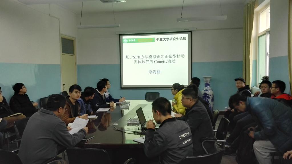 首先,王军老师介绍了李海桥博士的履历和研究成果。之后李海桥博士对“基于SPH方法模拟研究正弦型移动固体边界的 Couette流动”这一主题的研究背景与研究方法进行了基本介绍。应用SPH方法对活塞裙部-缸套间的润滑油的传输过程进行了数值模拟,研究润滑油粘性系数及发动机参数对润滑油传输过程的影响。最后,李海桥博士提出了自己今后的科研展望并回答了同学老师们的提问。