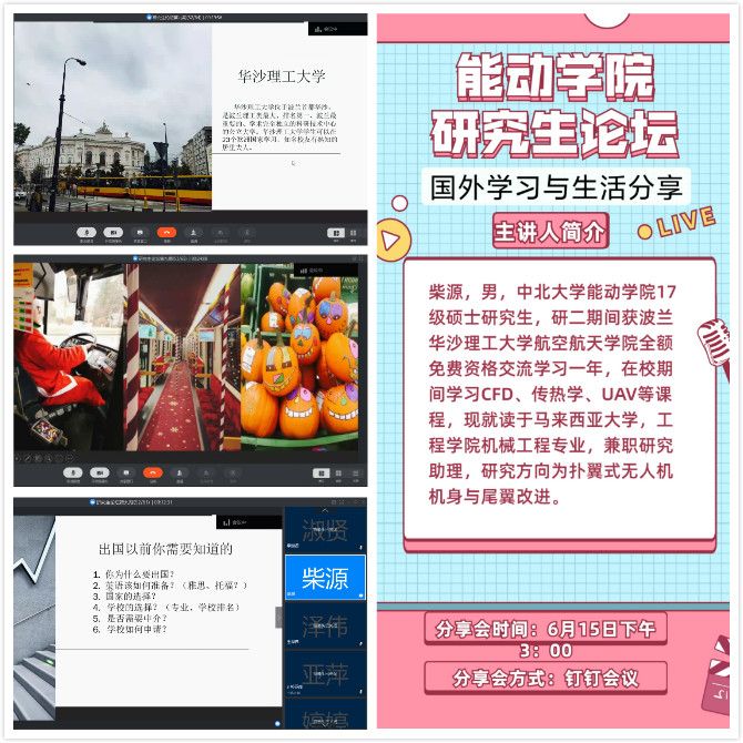 柴源同学研二期间获波兰华沙理工大学航空航天学院全额免学费资格交流学习一年,在外交流期间主修传热学、CFD、UAV等课程。现就读于马来亚大学工程学院机械工程专业。讲座中,柴源同学讲述了自己的科研经历,鼓励大家在恰当的时间做恰当的事情,要抓住机遇,努力做自己想做的事情,才能有所成就;并分享了在华沙理工大学的留学经历,让大家对国外的研究生学习有了初步的了解。之后,柴源同学热心地为大家解疑答惑,线上论坛在活跃的气氛中圆满结束。