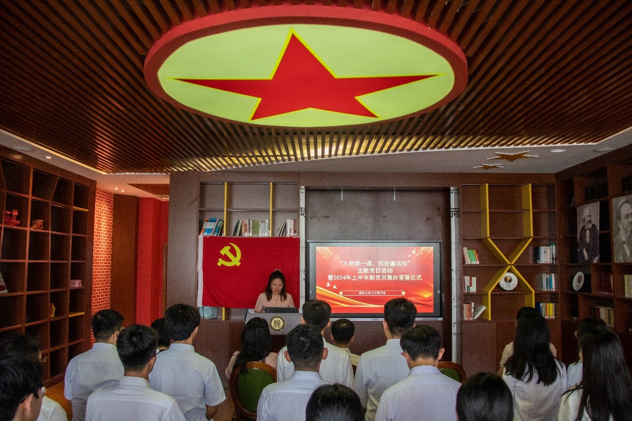 党委、头雁领航辅导员工作室于2024年7月1日下午,在校图书馆马克思书屋联合开展“入党第一课,扣好廉洁扣”主题党日活动暨2024年预备党员集体入党宣誓仪式。院党委书记胡向明、各学生党支部书记、本学期新发展的23名预备党员参加了本次主题党日活动,活动由院党委副书记任雁主持。