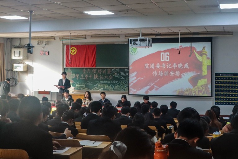 在08201H教室隆重举行2025-2026学年青共校培训开班典礼暨学生骨干换任大会。院党委书记胡向明、院党委副书记兼副院长任雁、院团委书记李晓彧、辅导员祁亚萍出席活动,学院各学生组织学生骨干、新入团团员及2024、2025级班团委员参加培训。
