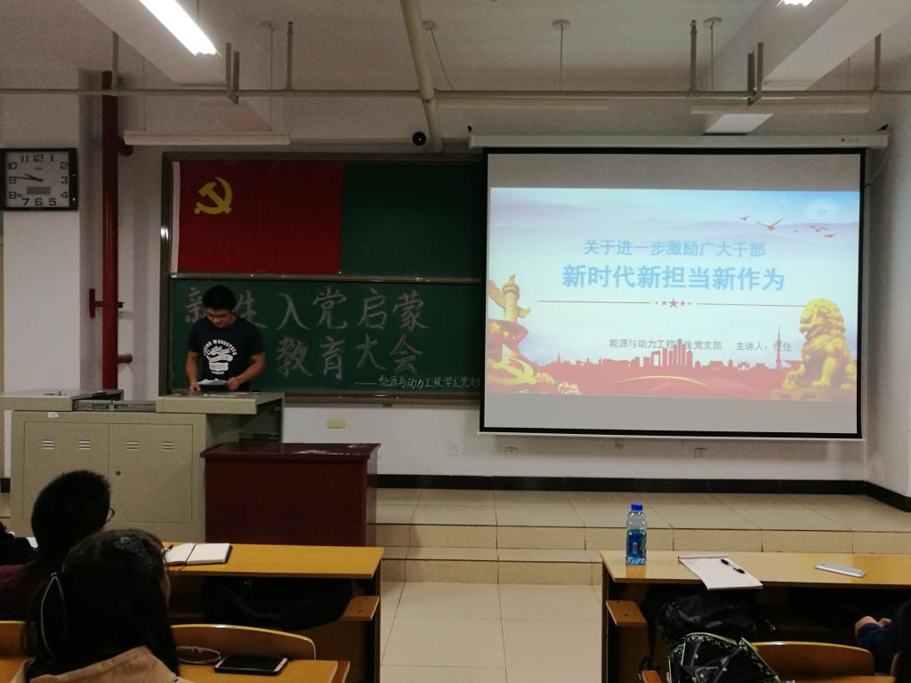 2018年9月25日下午四点三十分,能源与动力工程党支部全体党员在15016H召开了新生入党启蒙大会和“新时代新担当新作为”主题党日活动,全体能源与动力工程专业大一新生到场参加,本次会议由羊光耀同志负责主持。