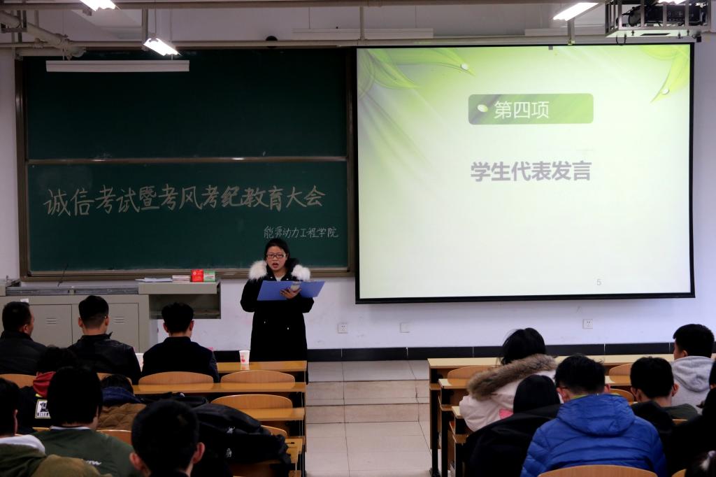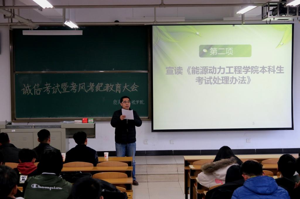 为严肃考风考纪,加强诚信作风建设,能源动力工程学院于12月7日下午四点在15202教室举办了诚信考试暨考风考纪教育大会。出席此次大会的嘉宾有院党委书记李运芝、教学副院长张翼、教学科科长马富康、学生科科长叶增民、辅导员老师乔洋、研究生辅导员唐金宝、杨勇。