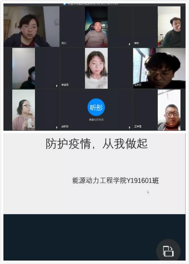 近日,一场场别样的主题班会吹响了师生协力、共同战“疫”的号角,能源动力工程学院各班级通过钉钉、腾讯会议等网络平台召开了新学期第一次主题班会,为同学们上了一堂特殊的开学第一课。这场特别的网上“云”班会,虽然形式发生了变化,由以前的线下变为线上,由从前的面对面变成键对键,但班主任对同学们的关心和关爱没有变,同学们对学校的想念和感恩也没有变。