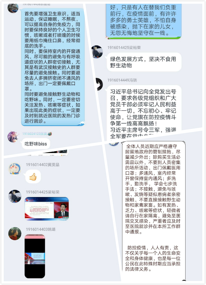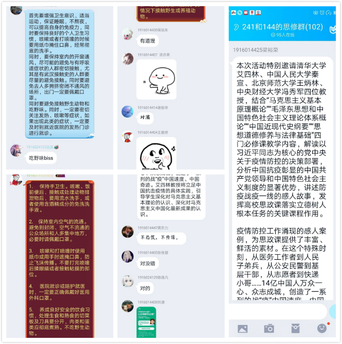 课程过后,同学们在线上展开了积极讨论。一位大四准毕业生说:“管住自己、帮助别人,武汉人民是可亲的;一方有难、八方支援,中国人民是可亲的;危难之际,伸出援手,世界人民是可亲的。我为自己身在中国而骄傲,为自己是一名中国人而骄傲,感谢伟大的祖国伟大的党。”