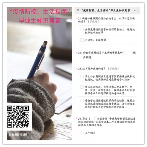 知识竞答内容涵盖疫情防控期间的学生管理相关规定、外出审批办法、学习生活服务安排、新冠肺炎防控知识等等。竞答从4月19日开始,持续进行了2天。竞答结束后,对答题准确且用时最短的前30名同学发放酒精消毒液、消毒湿巾等防疫物资作为奖品,倡导大家做好防护,健康生活。
