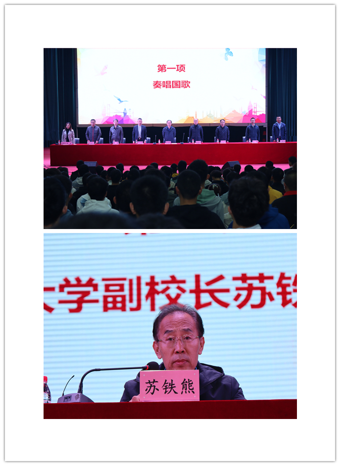 会议在庄严的国歌声中拉开帷幕,首先苏铁熊副校长发表讲话,他从学院的历史沿革出发,如数家珍的介绍了学院的办学历程和优秀校友,他希望各位新同学仔细思考四个问题:“我想干什么?我能干什么?我正在干什么?别人想让我干什么?”画出最大同心圆,收获最美人生路。