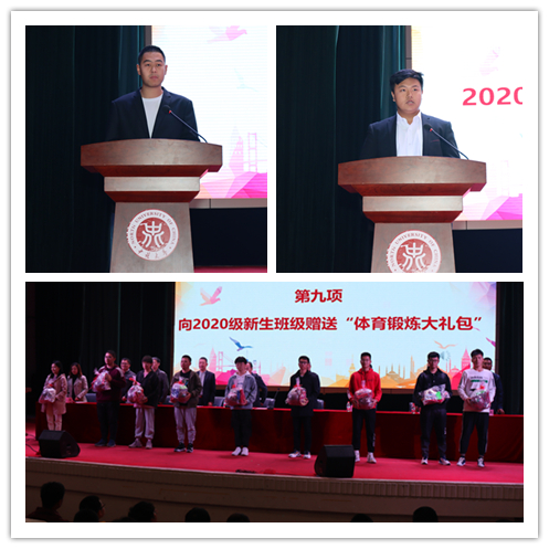 接着,在校生代表王佩佩同学发言,她建议大家在各类学生组织里充分发挥自身的才能,以“勤于能,探其源,动于心,力其行”的心态,把握今天,展望未来。研究生代表郭旭旭、本科生代表周佥同学分别发言,他们期待能够在大学学到更多的知识,面对更多的机遇与挑战,结识更多有共同理想的伙伴。为了鼓励新生加强体育锻炼,学院还为每一个新生班级准备了篮球、羽毛球、乒乓球等“体育锻炼大礼包”,号召广大同学走出宿舍,走进操场,拥有健康的体魄。
