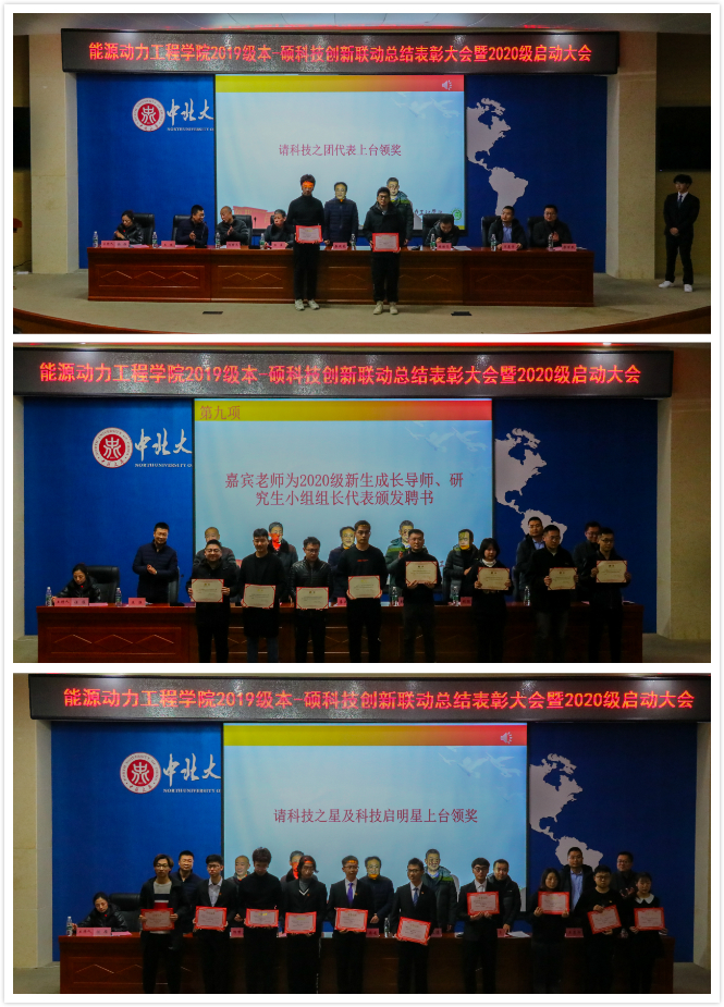 本-硕科技创新联动显著的成效,希望同学们在接下来的时间里,抓住机遇,开拓创新,积极参加各项赛事,为学校80年校庆献上一份别样的礼物。随后,2019级优秀科创学生代表李子源同学发言,他结合自身经历为同学们提供了宝贵经验和方法。之后,杨世文老师和王强老师分别宣读了《能源动力工程学院关于表彰2019级学生优秀成长宿舍和成长导师的决定》与《能源动力工程学院关于表彰2019年大学生科技创新中的先进集体和个人的决定》,并由主席台嘉宾为获奖代表颁奖。副院长张翼与副院长胡胜亮分别宣读了《能源动力工程学院2020年新生成长导师制实施方案》与《能源动力工程学院关于2020级本-硕科技创新联动的实施方案》并由主席台嘉宾为2020级新生成长导师、研究生小组组长代表颁发聘书。2020级新生代表万邦宸同学代表全体新生发言,铿锵的话语彰显新生参与创新、为院争光的决心。