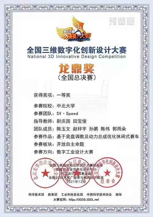 行知车队队员(机电工程学院陈玉文,能源动力工程学院赵梓宇、孙鹏、陈伟、郭雨朵)的作品《基于底盘调教及动力总成优化休闲式赛车》获全国总决赛一等奖。
