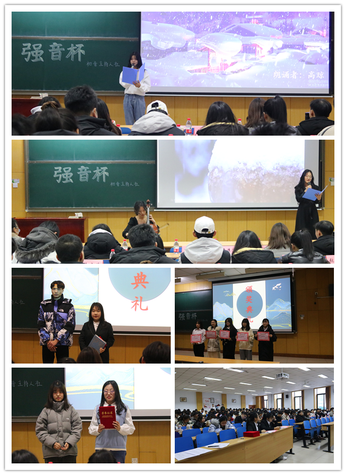 第一届强音杯冬日之音朗诵比赛决赛于11208教室完美举行。本次比赛邀请的嘉宾与评委有校社联主席姜思羽、软件学院团委候婉琪老师、软件学院执行主席赵源熙、团委副书记申超、社团部部长李婷、经济与管理学院学生会主席石树恒、心理站站长兰志扬、文体部部长徐晓媛、能源动力工程学院团委副书记李文慧、学生会主席团方泽涛、王雅婷、姚璐、社联主席周涛以及三个学院的部分学生骨干。