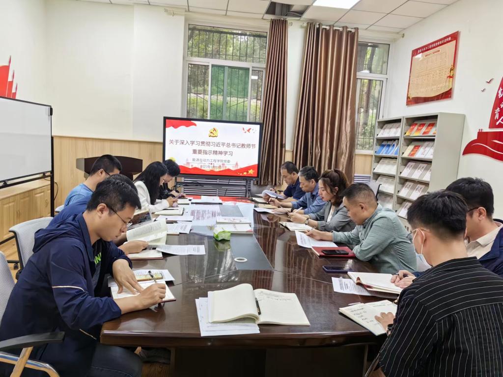 院党委副书记任雁同志领读习近平致全国优秀教师代表的信,并领学习近平总书记教师节重要指示精神。在重点发言阶段,副院长胡胜亮和能源工程系教工党支部书记王强同志分别结合自身学习情况及学院实际情况谈了自己的学习体会。胡胜亮同志表示,习近平总书记教师节重要指示精神,是指导学院未来工作的重要指南。在教育、科技、人才三位一体的教育强国建设中,学院应把教育家精神贯穿学校立德树人根本任务中,学院全体教师应当学习、践行教育家精神,并持续培育青年教师的教育家精神。王强同志表示,学习贯彻习近平总书记教师节重要指示精神,就是要向优秀教师看齐,牢记为党育人、为国育才的初心使命,躬耕教坛,潜心科研,为学科、专业发展做出自己的贡献。