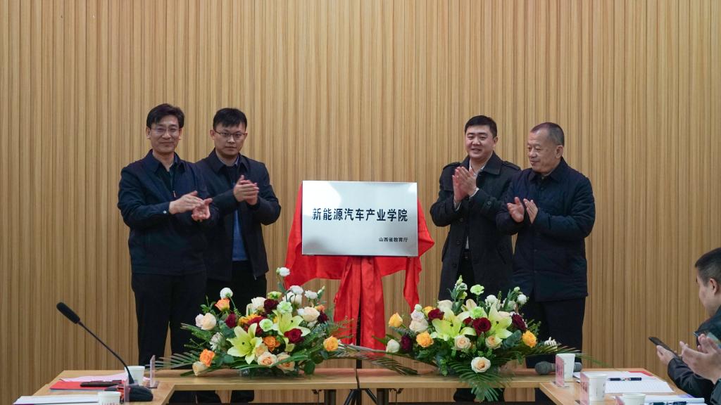 揭牌仪式上,来志斌、苏小威、靳茂林、贺晋伟共同为新能源汽车产业学院揭牌,并为来自大运汽车股份有限公司、山西吉利汽车部件有限公司、山西祥睿能源有限公司、华阳新材料科技集团有限公司、山西省高质量转型发展研究院的企业导师颁发聘书。