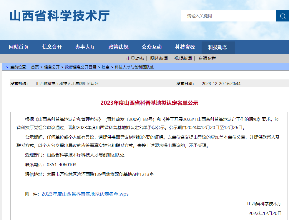 近日,根据《山西省科普基地认定和管理办法》和《关于开展2023年山西省科普基地认定工作的通知》要求,山西省科技厅公布了2023年度山西省科普基地认定名单。通过公开申报、专家评选等环节,全省共有32家单位被确定为省级科普基地,由色情小说