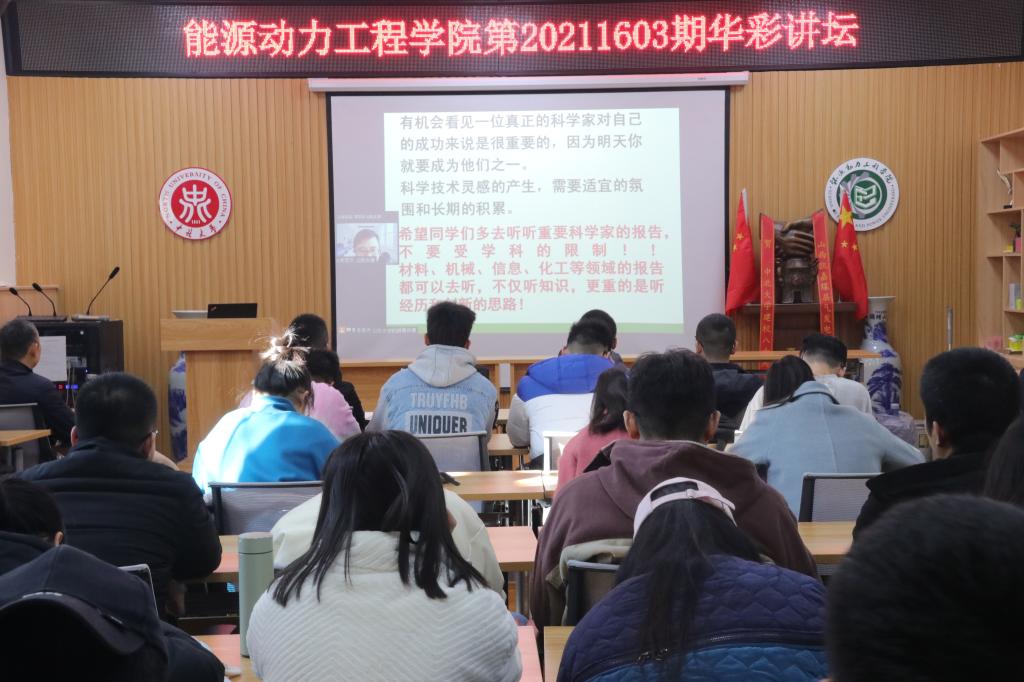 教授李英杰作了题为《面向碳中和的煤电CCUS技术——兼论给研究生学习阶段的建议》的学术报告。讲坛由能源动力工程学院院长刘汉涛主持,学院相关学科的青年教师和研究生参加了学习。